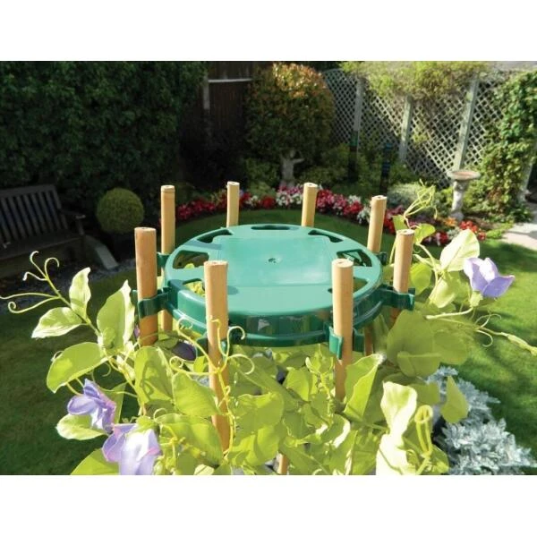 De schijf verbindt 8 bamboestokken in een kliksysteem waar de stengels in worden vastgeklikt. Ideaal voor reukerwten, snijbonen en vele andere klimplanten zoals suzanne-met-de-mooie-ogen, cobea, blauwe winde,…