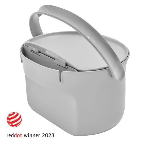 De keukenafvalemmer is zeer ergonomisch ontworpen en kan met één hand worden geopend. Het deksel is afneembaar en alle onderdelen kunnen in de vaatwasser voor een perfecte hygiëne. De binnenkant is afgerond en glad afgewerkt wat het vastzitten van vuil minimaliseert en het schoonmaken vergemakkelijkt. De afvalemmer neemt bovendien weinig plaats in op het aanrecht.