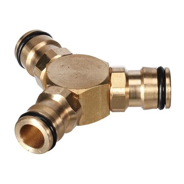 Universele koppeling in messing of geelkoper voor het aansluiten van drie standaard tuinslangen of druppeldarmen.