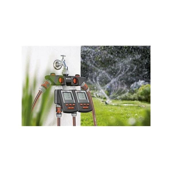 Met de GARDENA 4-weg-waterverdeler sluit je gelijktijdig vier accessoires aan op één kraan. De uitgangen zijn traploos regelbaar. Op de verdeler kunnen bijvoorbeeld twee GARDENA besproeiingscomputers of watertimers worden aangesloten.